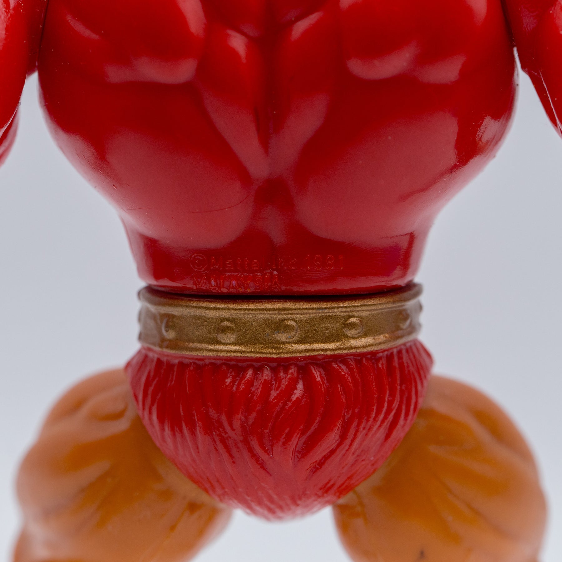 The figure is marked © Mattel, Inc. 1981 MALAYSIA, with an unmarked crown and spear, and the back of the armor stamped © Mattel, Inc. 1983.