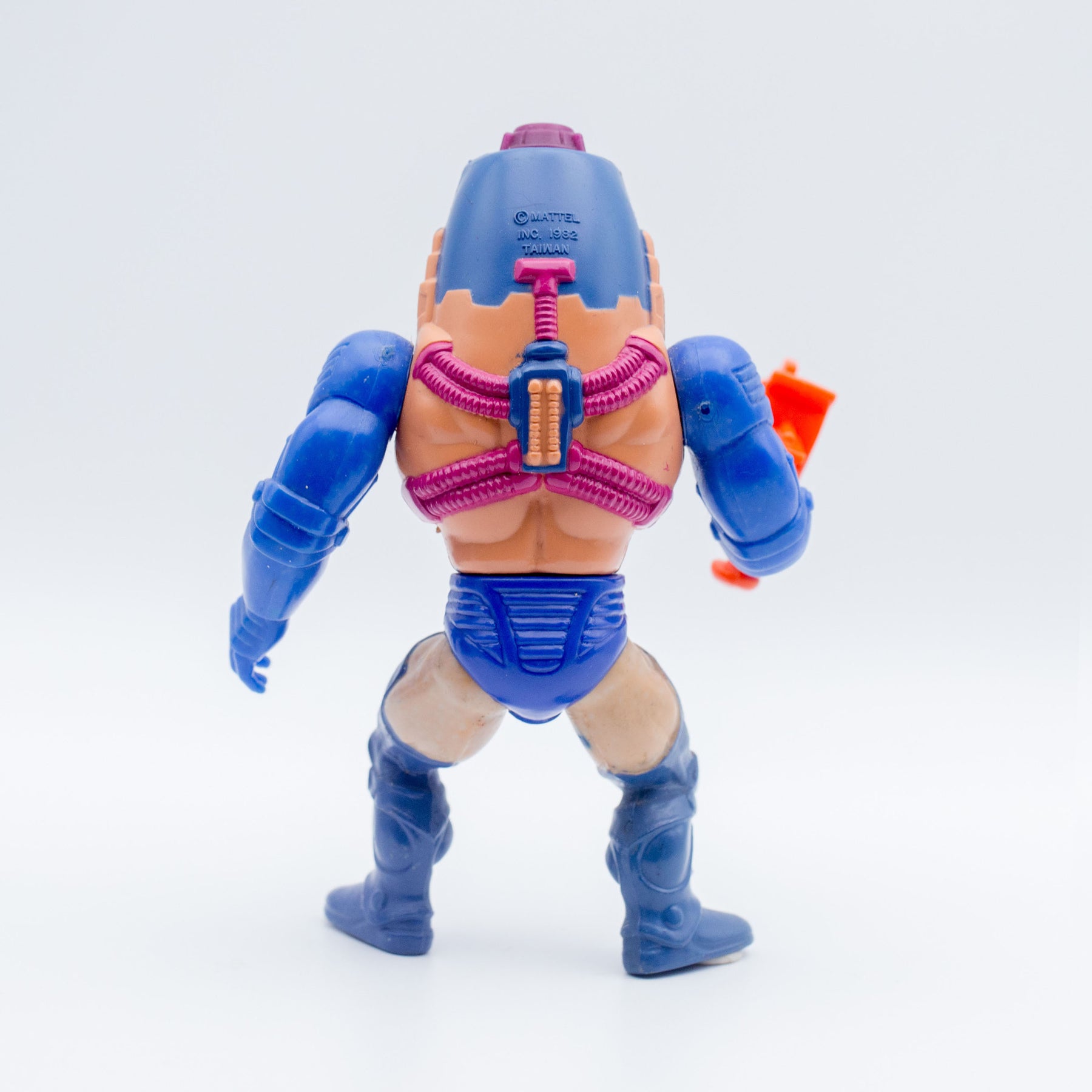Originally released during the second year of the Los Amos del Universo production (1985), this version is marked © MATTEL INC. 1982 FRANCE behind the head. It includes a dark orange, opaque, and very rigid gun also marked FRANCE. This initial release was available with either regular (human-sized) eyes or notably small eyes.
