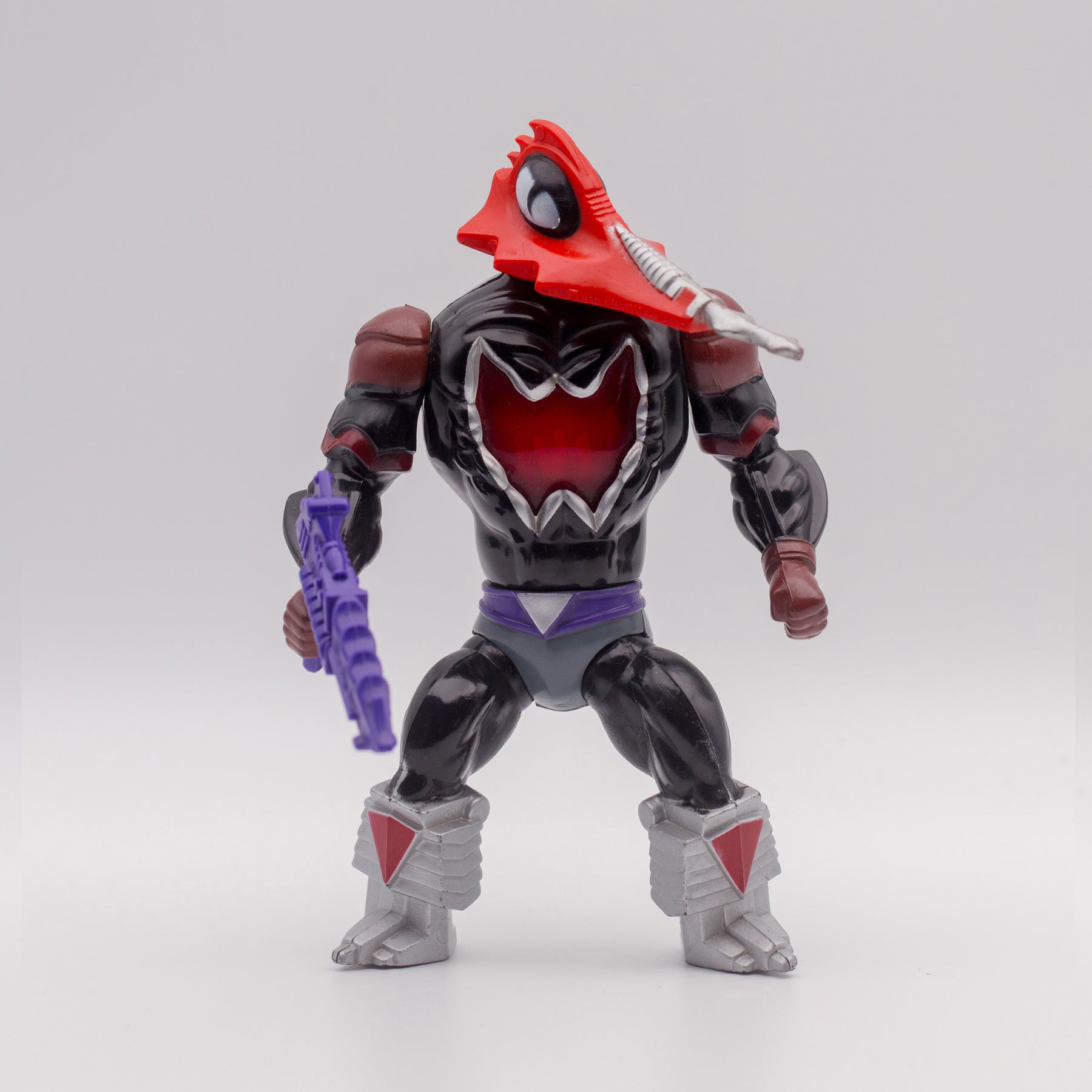 The figure is marked © Mattel, Inc. 1986 on both the lower back and the side of the face, with the weapon carrying the same marking. The weapon is molded in rigid purple plastic. Overall, the figure’s build and paint quality is less refined compared to other Mosquitor releases.