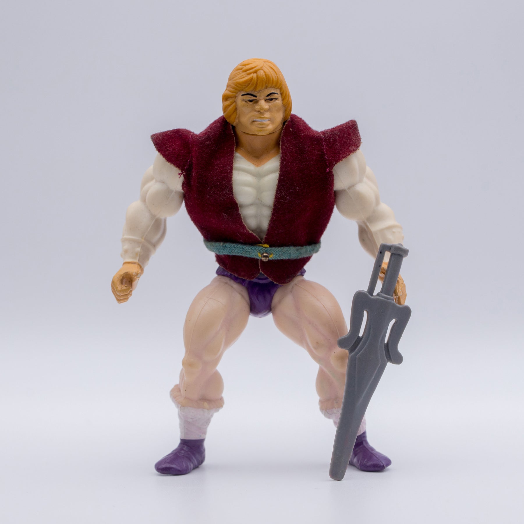 The Leo India Prince Adam features a hard plastic head, low-rise purple boots, and the characteristic smooth shorts texture found on all Leo figures. The vest is thick and rigid, made of one-piece cloth with stitched shoulders. The belt is blue with a golden buckle.